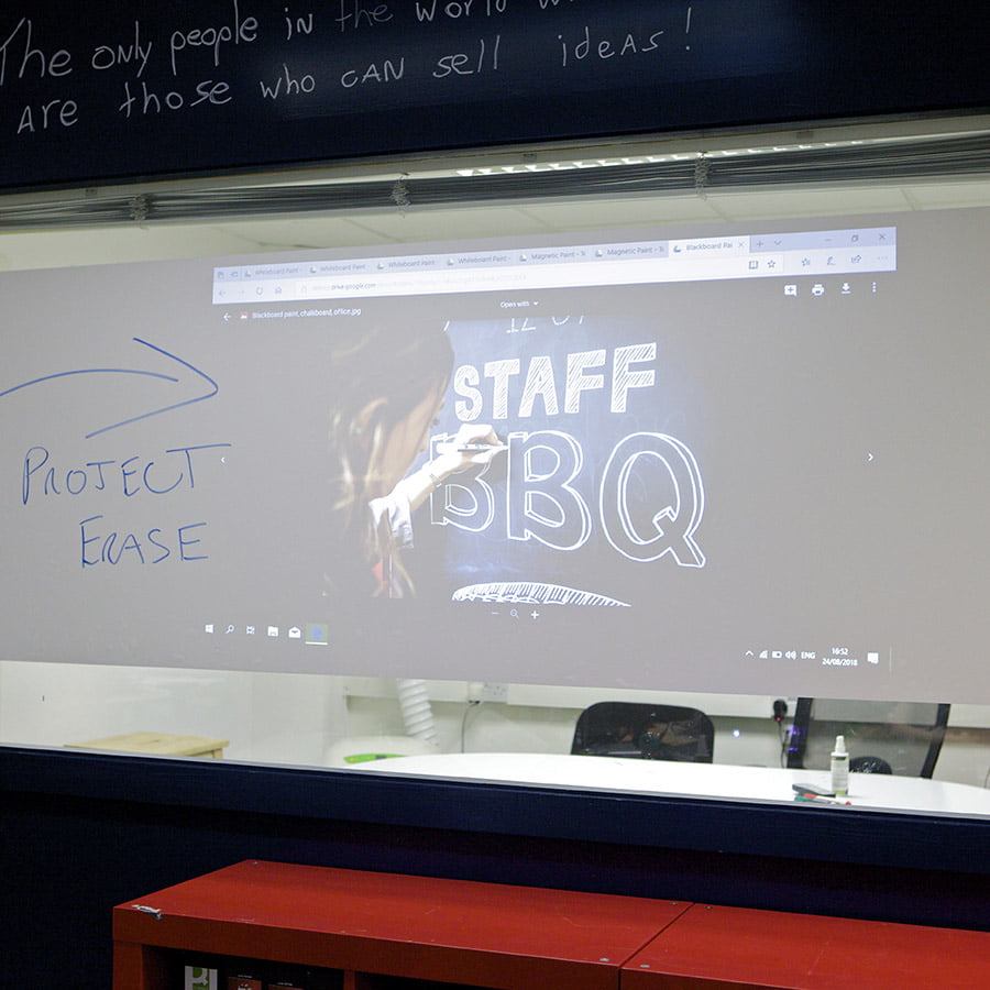 This product is designed for application to smooth surfaces such as glass, old whiteboards, old blackboards, office furniture, glass, metal etc. For walls, plasterboard or uneven surfaces, please view our wallcoverings or whiteboard paints.